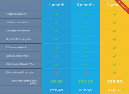 保费计划每月 9 美元起,提供定期折扣。该服务提供了一个简单的计划。在美国、英国、爱尔兰、加拿大、德国、瑞士、法国、西班牙等八个国家设有 加速器 服务器。个人帐户(共享 IP)的费用为每月 5。